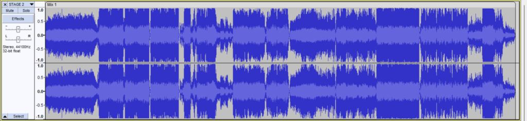 Immediately, this visualization shows how much variation there is in volume throughout the stage. Each track can be easily identified, as well as the silences between them. Additionally, some tracks crescendo and decrescendo in volume, which is a clear change from Stage 1, which stayed nearly the same volume throughout.