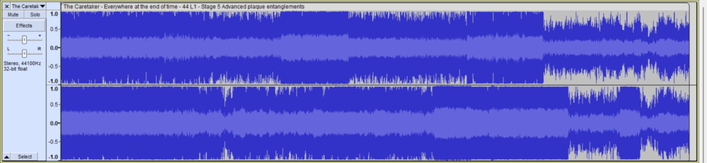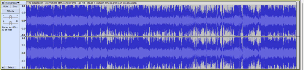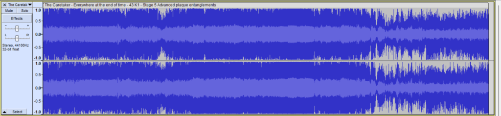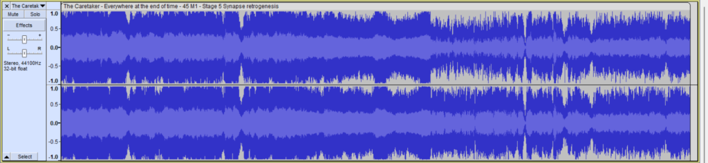 However, some familiar themes pop up between tracks, such as the alternation between white noise and rapidly changing notes. This could be considered the “unfamiliar becoming familiar” that Leyland Kirby mentions in his description of Stage 5.